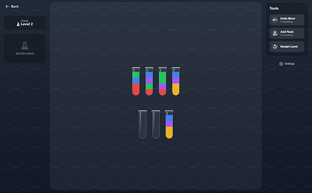 Aqua Sort - Water Color Puzzle is a logic game where you must sort colored liquids into flasks until each one contains only a single shade. This logical challenge tests your patience and observation skills across more than 1000 progressive levels. The concept relies on simple rules: tap a flask to take the top liquid, then tap another one to pour it, knowing that you can only mix identical colors or use an empty container. Six distinct game modes enrich the experience, from classic to time trial, including mystery and fusion variants that constantly renew the challenges. The game offers strategic aids such as undoing the last move or adding an extra flask to unlock complex situations. As you progress, you will unlock new visual themes and achievements that reward your skill. The interface adapts perfectly to mobile screens as well as computers, ensuring smooth gameplay on all platforms. Soothing sound effects and background music create a relaxing atmosphere that supports concentration. Each completed level brings you closer to new discoveries while refining your organization and anticipation skills. Enjoy!