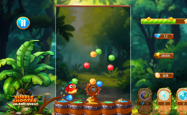 A pirate parrot points its cannon toward the lush canopy and gives you a simple mission: prevent the colorful bubbles from taking over the screen by popping them before they reach the bottom. You aim, you adjust the angle, then you release to send your bubble to join its mates, reds with reds, blues with blues, yellows with yellows. As soon as three identical bubbles touch, they explode in a chain reaction and sometimes cause whole clusters to fall, offering that immediate satisfaction that makes the game as addictive as it is relaxing. The tropical jungle scrolls beneath your eyes, adorned with vines and barrels, and each level sets a warm atmosphere that contrasts with the discreet but real pressure of the bubbles steadily descending. As levels progress, the situation becomes more complex: special bubbles appear, such as eggs to collect in specific numbers or coins to pick up along the way, and each shot matters more because your ammunition is limited to 35 shots per level. When the layout gets tight, you can activate power-ups stored in barrels, notably the rainbow bubble that adapts to any color, to get you out of a bad spot. Gems and coins collected during play are used to fund these upgrades, inviting you to manage your resources in the long term as much as your shot-by-shot precision. Each level displays its objectives as stars and trophies to earn, and progression to the next island depends on your ability to clear everything without wasting your chances. It is your turn to play! Enjoy!