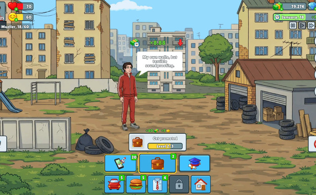 Life Simulator - Road to Riches places you in squalid neighborhoods, with no money and no comfort, with a single prospect, to transform a precarious life into sustainable social ascent. From the first days, you accept a small job, you watch every expense and you quickly feel the pressure rising, because earning a little money is not enough if your health declines or if your morale collapses. A playthrough advances through very concrete stages, you work, you eat to hold on, you launch a few activities to avoid a nervous crisis, then you finally see your situation stabilize. This rhythm creates a sensation of continuous progress, because each day brings you closer to better housing, a more rewarding wardrobe and a more respectable place in the city. You do not only contemplate a future fortune, you build it from a fragile routine that can break at any moment. As you progress, you choose how to improve your profile to unlock more prestigious careers, since education, clothing and housing directly influence accessible jobs. You must also complete the current objectives, collect their rewards and raise your reputation, an essential detail to open the next part of the path. When all the conditions of a stage are met, you can move to a new neighborhood, which immediately changes the standard of living, professional opportunities and the goods you can access. Between an essential meal, an ambitious purchase, an investment in studies or the desire for a more luxurious vehicle, choices multiply and they never all serve the same need. Money also continues to accumulate during your development, which gives the game the breath of a very satisfying idle tycoon, without making the risks of failure disappear. It is up to you to play! Enjoy!