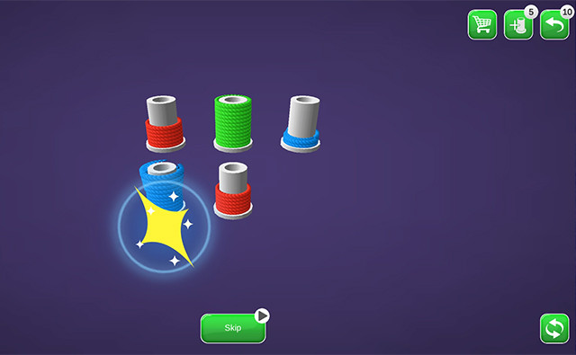 Rope Sorting challenges you to untangle and organize colorful ropes in a puzzle that stimulates your logic. This brain teaser offers a relaxing experience while putting your strategic thinking skills to the test. You will have to skillfully manipulate the spools to group ropes of the same color, following one essential rule: only the top rope can be moved each turn. With an infinite number of levels at your disposal, you can progress at your own pace and collect stars as you succeed. Helpful aids accompany you on your journey: the rollback action allows you to fix mistakes, while adding extra spools makes it easier to solve the trickiest challenges. The goal is to fill each spool with ropes of the same color to complete the level. Enjoy!