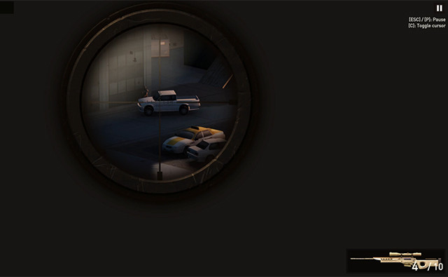 Use the mouse to aim and to shoot, the spacebar to toggle zoom, 1-4 to switch sniper, Q / Mouse wheel to switch weapon, R to reload, M to mute and Esc / P to pause the game.