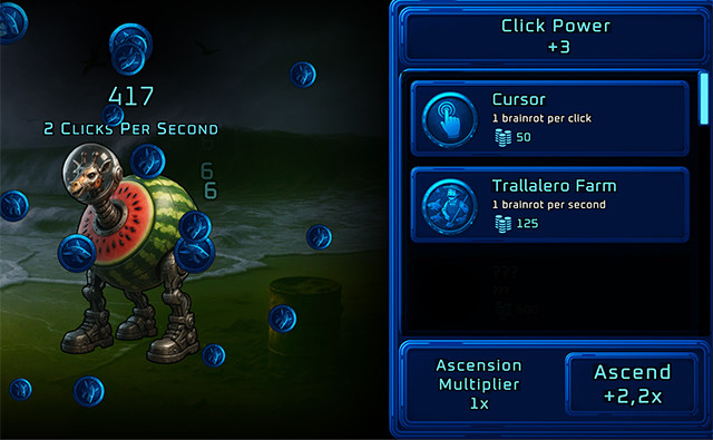 Ultimate Brainrot Clicker throws you into a futuristic meme universe where AI-generated absurdity collides with Italian meme culture in a digital symphony of chaos. You must click frantically to generate Neural Coins, the quantum currency that allows you to unlock outrageous characters and witness the total meltdown of meme logic. This incremental game turns every click into an addictive experience where you collect characters from viral meme culture. Begin your journey with Tralalero Tralala, a Nike-shark fitted with glitch implants, and explore a world filled with bizarre and hilarious creatures. Costs and rewards escalate quickly, often shown in scientific notation, creating an exponential progression that keeps you engaged. The more you click, the more upgrades and meme entities you unlock to enrich your absurd collection. Enjoy!